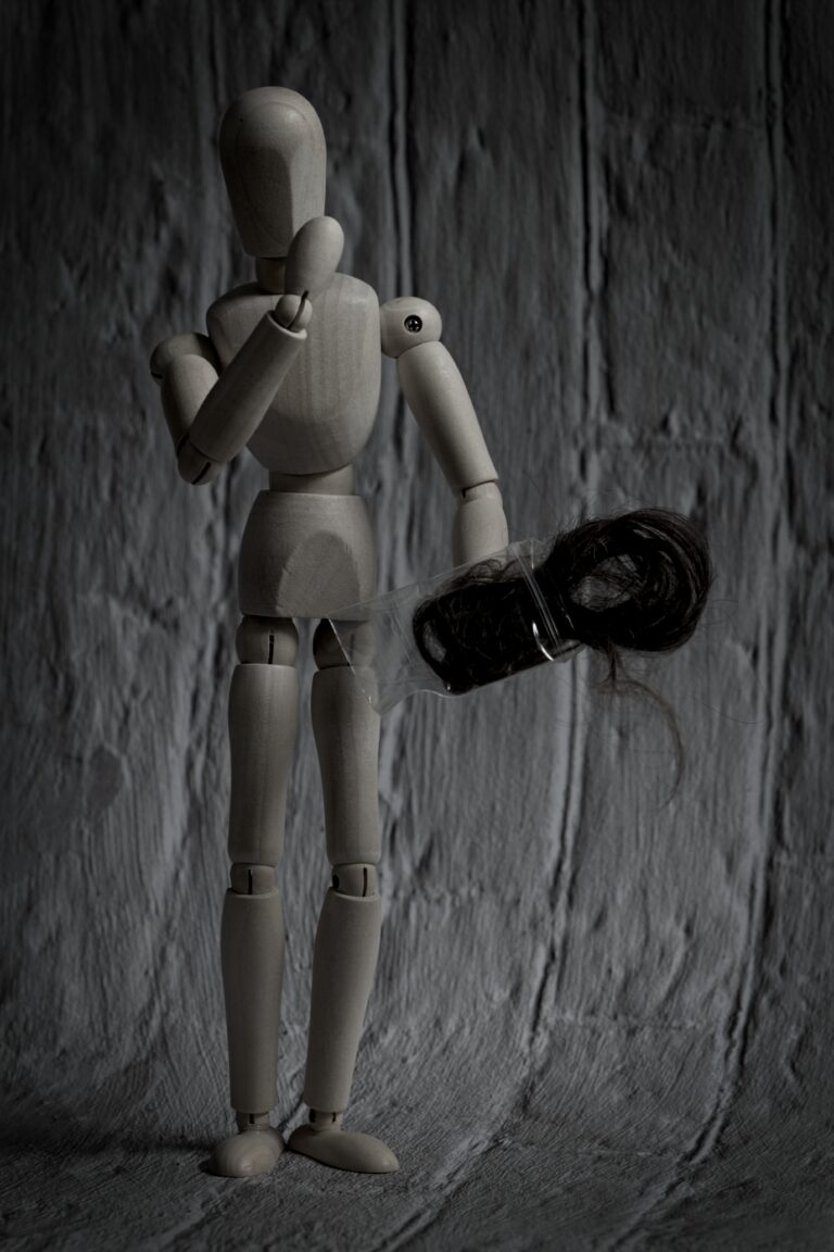 In the photo, a wooden figure stands frozen, one hand raised to its face, the other holding a plastic bag with a lock of hair inside. There’s no explicit violence, nothing overtly grotesque, but the tension is palpable. It’s that moment where suspicion crystallizes into understanding, where all those tiny unsettling moments come sharply into focus.